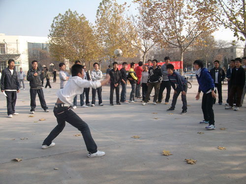 比赛前,健美操协会会长宣读了比赛流程和注意事项。比赛以抽签的形式进行,每队三男一女,分“手颠排球”、“绿色保龄球”、“多人跳大绳”、“垃圾回收——筷子入篮”四个环节。在“手颠排球”中,两人配合默契,屈身、起跳,快速击球,体现了选手们齐心协力、团结合作的精神。“绿色保龄球”则锻炼了选手们对球的控制水平和判断能力。“多人跳大绳”环节设置时间较长,充分展现了选手们坚持不懈、永不服输的气质。在“垃圾回收――筷子入篮”处吸引了众多学生驻足观看。比赛中,每名队员用准备好的一次性筷子投向两米外的篮子,在规定时间内投篮最多者为胜。选手们以前倾、侧身等姿势投篮,投进时激动尖叫,失误时耐心坚持,精彩处博得现场观众阵阵掌声。