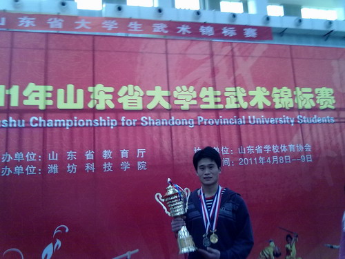 4月8日到9日,由山东省教育厅主办的2011年山东省大学生武术锦标赛在潍坊科技学院体育馆举行。经过2天激烈角逐,我校武术运动员在13所高校的122名运动员中脱颖而出,摘得1金2银3铜,一举夺得团体总分第二名,同时荣获“体育道德风尚奖”,教练员胡鹏被评为“优秀教练员”,为学校争得了荣誉。