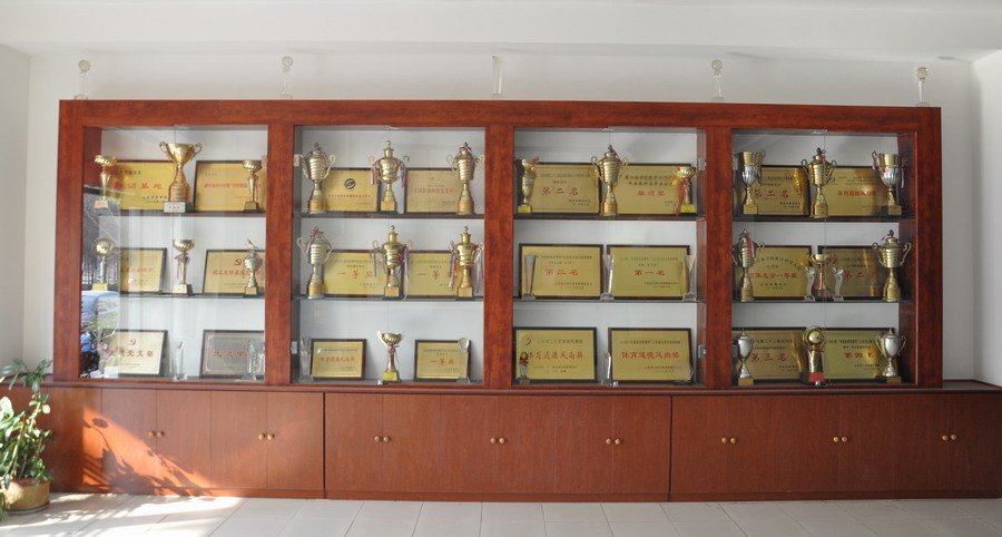 该荣誉墙长?xml:namespace>7米,高2.7米,主体为荣誉展示橱窗,橱面为古铜色,远观近视给人古典高雅之感。内部摆放奖状、奖杯,较为全面的展示了近年该院在党建思政、竞技体育、教学科研、人才培养、综合保障等方面所获荣誉,体现了我院师生锐意进取、勇于赶超的精神风貌。?xml:namespace>