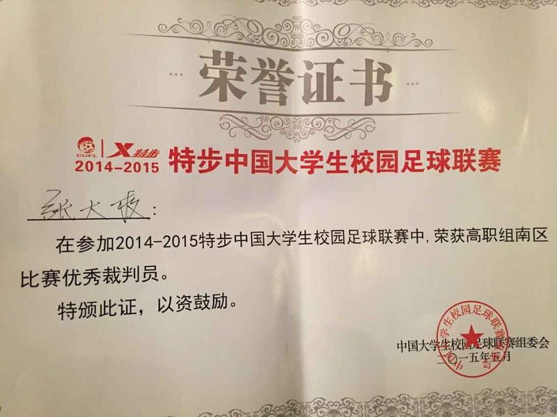 5月20日—27日,2014—2015特步中国大学生校园足球联赛高职组南区比赛在江苏扬州工业职业技术学院举行,我院2012级运动训练专业张大权同学在比赛中凭借着公平、公正和严格的赛场执法,获得大赛“优秀裁判员”称号,首获此项荣誉,为校争得了荣誉。