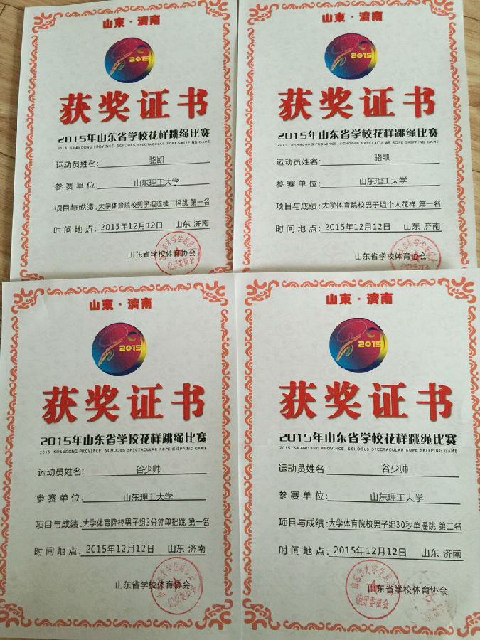 12月11日,2015年山东省学校花样跳绳比赛落下帷幕,这是我省首次举办的跳绳比赛,由我校williamhill威廉希尔青年教师王丹带领的williamhill中国代表队在大学体育院校组比赛中夺得3个冠军和1个亚军的优异成绩。其中,williamhill威廉希尔2012级体育教育专业学生谷少帅获得3分钟单摇跳冠军,30秒单摇跳亚军,2013级体育教育专业学生骆凯获得三摇跳冠军,个人花样冠军。