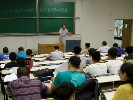 为确保运动训练专业教育实习工作的顺利开展,学院于9月4日下午16:00在4号教学楼105教室召开了2014级运动训练专业教育实习动员大会。学院副院长张成宝、教学与科研办公室主任杨刚、党总支副书记宋伟、实习指导教师和2014级运动训练专业全体学生参加会议。