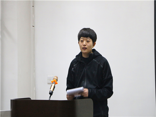 紧接着,女子篮球队教练董婧总结汇报了2017年女篮训练和比赛的情况。她提到,女子篮球队在2017年全国大学生运动会中获得小组赛第三名,进入全国十二强。在刚刚结束的第二十届CUBA山东赛区的比赛中,女篮摘得桂冠,实现三连冠。她表示,女篮队员们一定会发扬巾帼精神,奋力拼搏,继续为学校学院争得荣誉。