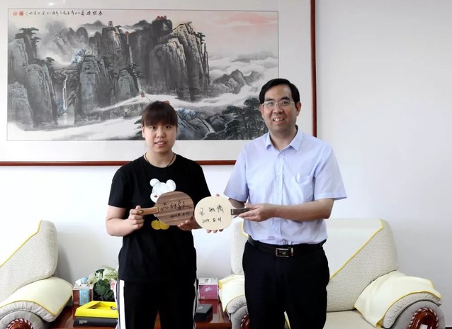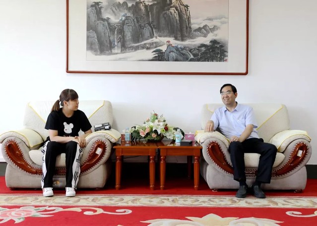 在现场检查指导结束后,学校党委书记吕传毅,党委常委、副校长张祥云在鸿源楼八楼接待室,会见了获得第二届全国青年运动会乒乓球比单打、混双冠军的2019级新生王丽倩。吕传毅对王丽倩夺冠、为学校争光表示祝贺和感谢,并勉励她勇攀高峰,向世界冠军,奥运冠军冲刺。并指出,身后的专业知识、理论功底以及顽强的意志品质,是运动员能够走得更远的重要支撑,希望王丽倩加强对这方面的学习和磨练,为学校、山东省和祖国争光。