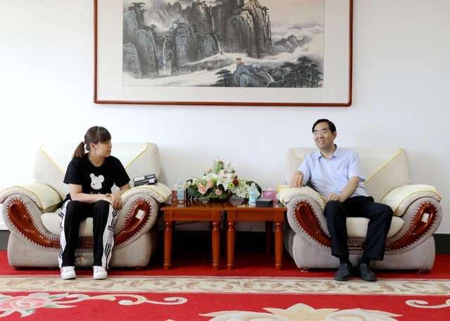 正值新生报到期间,校党委书记吕传毅、党委常委、副校长张祥云在迎新现场检查指导结束后,在鸿远楼八楼接待室,会见了最近在第二届全国青年运动会乒乓球比赛中获得单打、混双冠军的我院2019级新生王丽倩。