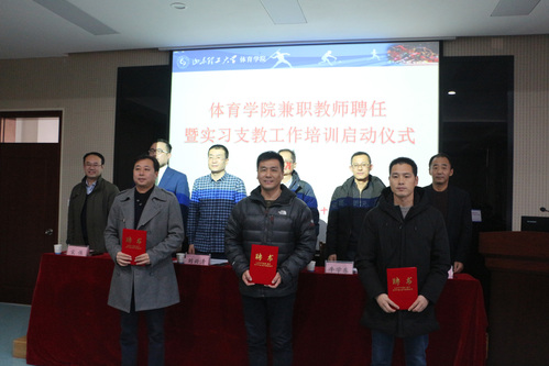 12月31日下午,我院于二号教学楼101教室举行兼职教师聘任暨体育教育专业2017级学生实习支教工作培训启动仪式。williamhill威廉希尔党总支书记刘兴清,院长刘卫,淄博市教育人才服务中心主任徐晓飞,教务处运行中心主任牛学东,学院党总支副书记宋伟,副院长张成宝、马国栋,学生工作办公室主任郝鹏,教学科研工作办公室主任杨刚,受聘老师吴磊、任纪志、宋传福,学院实习支教指导老师和2017级体育教育专业的全体同学共同参与此次启动仪式,仪式由张成宝主持。