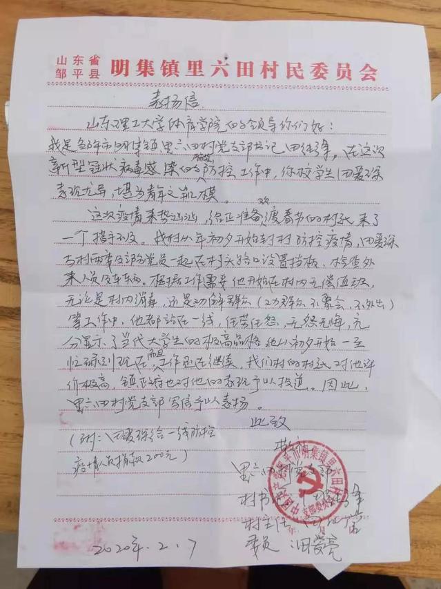 2月7日,我院收到一封来自邹平县明集镇里六田村的信,信中写道:“在这次新型冠状病毒感染的肺炎防控工作中,贵校学生田爱琛表现优异,堪为青年之楷模,他从除夕开始就一直忙碌到现在,而且工作还在继续,我们村的村民对他评价极高,镇政府也对他的表现予以报道,因此,里六田村党支部特写此信予以表扬。”