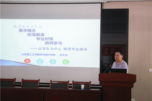 随后,孙文华表示会议之前已经与我院部分教师进行体育教育专业情况交流,认为专业认证工作需要根据学院自身学科特色进行,以学生为中心,推进专业建设,制定大体的工作计划与宏观认识。紧接着,分享数学专业准备及通过师范类专业认证的经验,表示专业认证要以“学校统筹,学院主导,以专业为主体,全员参与”为道路。并且专业认证工作的定位不是目标,而是“抓手”、“突破口”与“着力点”。之后提到对专业认证的三点认识,第一点:认证背景,包括一个根本、两目个标、三个任务与师范教育的地位;第二点:认证规范,包括认证原则、认证标准与认证价值;第三点:认证体会,专业认证工作即是任务也是责任,既是机遇也是挑战,把握好机遇,营造氛围,提早谋划。之后孙文华通过案例对课程考核分析报告撰写应该注意的问题进行了详细的讲解,并与参会教师就相关问题展开了讨论与交流。
