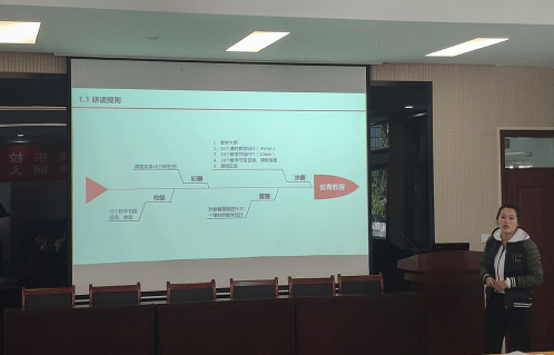 会议伊始,学院青年教师阚世超(2020年山东省高校青年教师讲课比赛一等奖获得者)进行了参赛经验分享,她从赛前准备、教学设计、课堂教学、教学反思和感想五个方面讲解了在比赛时需要注意的地方。她讲到在比赛中,精神要饱满,教学手段运用熟练,课件制作要精美,教学手段运用熟练,要充分展现出青年教师的教学风采。