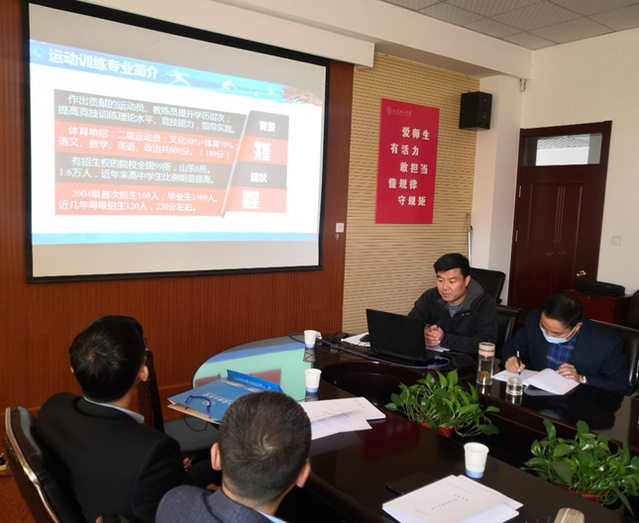 根据专业评估现场考察工作要求,运动训练专业负责人高博从专业定位与建设规划、师资队伍及教学水平、教学建设及教学效果、教学管理、专业特色、问题及措施等方面向专家组进行了汇报。汇报结束后,专家根据在审阅自评报告中发现的问题和通过听汇报需要进一步确定的问题做了针对性的提问和交流。
