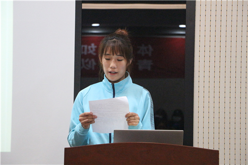 老队员代表李进发言中表示大学是一个全新的起点,需要更加努力地把握每一次训练,牢记入队初心,增强自身素质,努力为学校学院争光。新入队队员代表徐明睿表态发言,她表示将严格遵守校规校纪和训练要求,认真学习,刻苦训练,以严肃的态度来对待训练和学习,实现自身的不断超越。