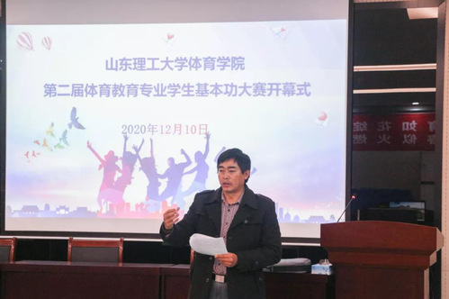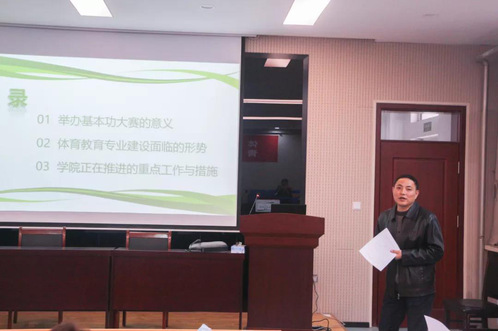 会议伊始,宋伟介绍出席本次开幕式的领导、老师、同学,并宣布基本功大赛开幕!随后,杨刚围绕举办基本功大赛的意义、体育教育专业建设面临的形势以及学院正推进的重点工作与措施三个方面进行解读,并重点提出了加强专业思想教育、强化教学联动、贯彻落实“教会、勤练、常赛”的要求,表示今后将严格实施教考分离、实施教学技能训练与达标等一系列重要措施。