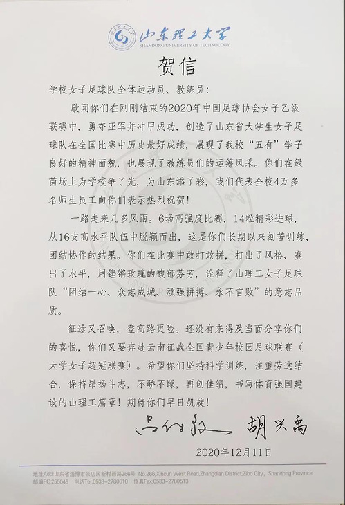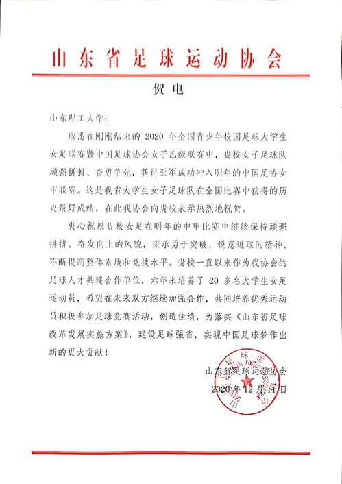 吕传毅、胡兴禹在贺信中说,欣闻你们在刚刚结束的2020年中国足球协会女子乙级联赛中,勇夺亚军并冲甲成功,创造了山东省大学生女子足球队在全国比赛中历史最好成绩,展现了我校“五有”学子良好的精神面貌,也展现了教练员们的运筹风采。你们在绿茵场上为学校争了光,为山东添了彩,我们代表全校4万多名师生员工向你们表示热烈祝贺!