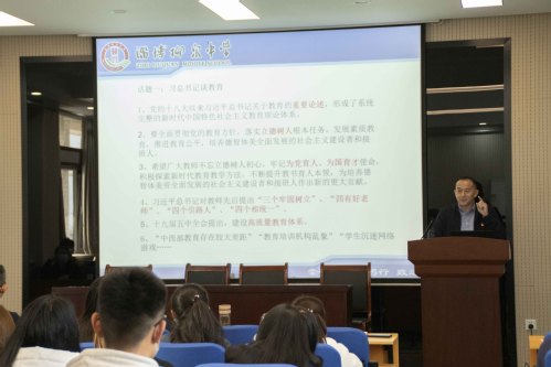 接着,赵玉亮以“我们聊教育”为主题作报告,他从习总书记教育思想解读、中学体育、教育之变、中学新教师的困惑等四个方面进行了深入浅出的分析与讲解,既有理论高度,又有实践经验,还提出了意见与建议,对我院进一步做好实习支教工作具有很好的指导作用。