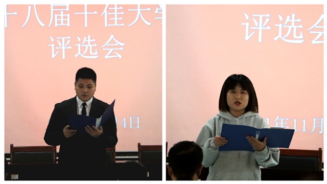 杨玺,唐春阳依次进行个人陈述答辩,两位候选人以演讲形式进行答辩,结合自己在学习情况、社会实践、志愿服务、入学表现、学生工作、竞赛获奖等方面取得的成绩,展现自身特色和优势。