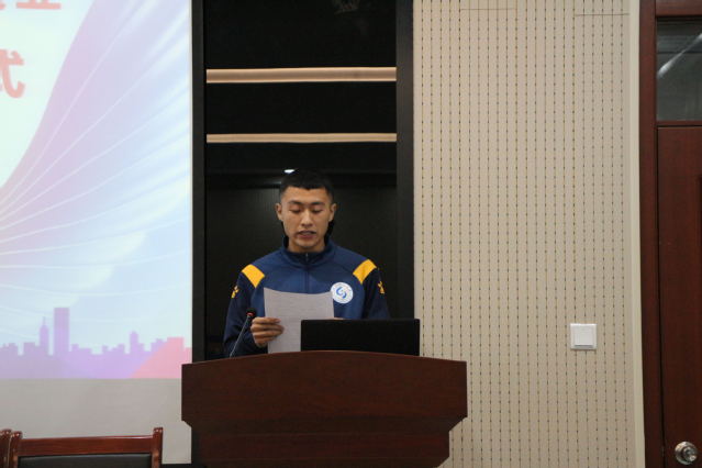 学生代表马行发言,他首先感谢学校和学院领导老师们支持、鼓励与教导,并承诺在接下来的比赛中严格遵守各项纪律规定和比赛规则,团结协作,顽强拼搏,不负学校和学院师生的期盼,争创佳绩,载誉归来。
