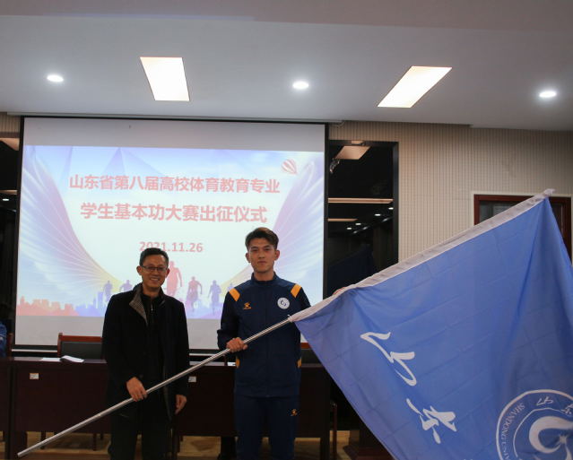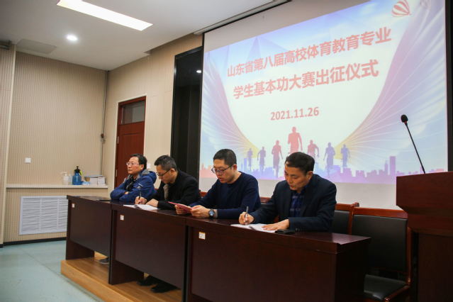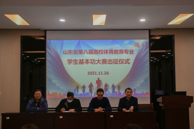 为强化体育教育专业学生教学基本素质和基本能力,提升人才培养质量,我院选派8名2019级体育教育专业学生参加11月28日-12月2日在滨州学院举办的山东省第八届高校体育教育专业学生基本功大赛。11月26日,学院于2号教学楼101报告厅举行基本功大赛出征仪式,学校教务处副处长牛学东受邀莅临仪式,学院党总支副书记赵鹏,科研副院长马国栋,教学科研办公室主任韩军梅,指导教师以及体育教育专业所有参赛选手共同参加会议。