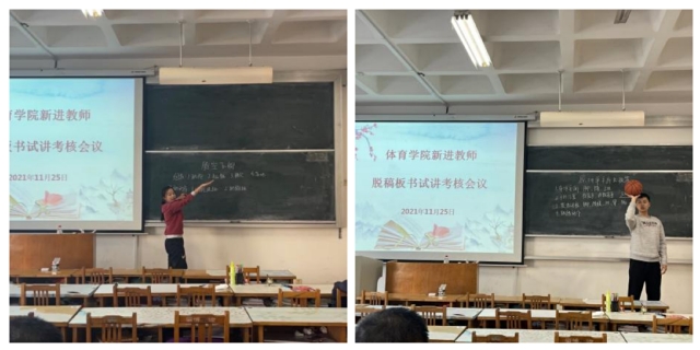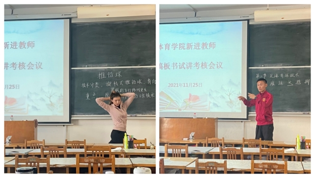 参加考核的6位青年教师分别从《田径》、《足球》、《武术》、《篮球》、《排球》等课程中选取一个知识点或教学片段依次进行了20分钟的脱稿板书试讲,主要从课程导入、分解教学、思政融入、总结归纳、课下作业等几个部分呈现教学过程,体现出体育教师较好的专业素养和教学水平。