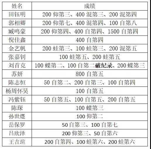 游泳队为非常训队,在比赛前两个月开始组队集训,在主教练耿琳的带领下,全队克服场地少、训练时间少、恢复时间短等诸多困难,积极备战,刻苦训练。在两天紧凑的比赛中,16名队员团结协作、奋勇拼搏,最终斩获佳绩!同时,耿琳老师获得“优秀教练员”称号,刘首克、吕欣泽被评为“优秀运动员”。