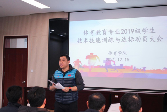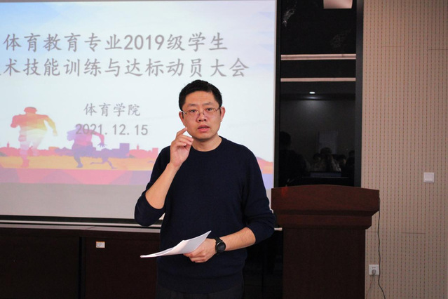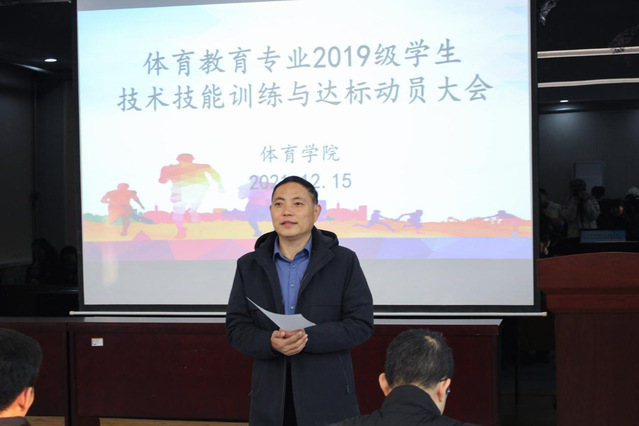 为落实“学生中心,产出导向,持续改进”认证工作理念,进一步提高学生专业技术技能水平,更好适应中学体育工作要求。12月15日上午,学院于2教101会议室举行体育教育专业2019级学生技术技能训练与达标动员会议。学院党总支副书记赵鹏,副院长杨刚,团委书记、学生工作办公室主任李昌朕,教学科研办公室主任韩军梅,体育教育系主任胡鹏,辅导教师以及体育教育专业2019级全体学生出席会议,此次会议由杨刚主持。