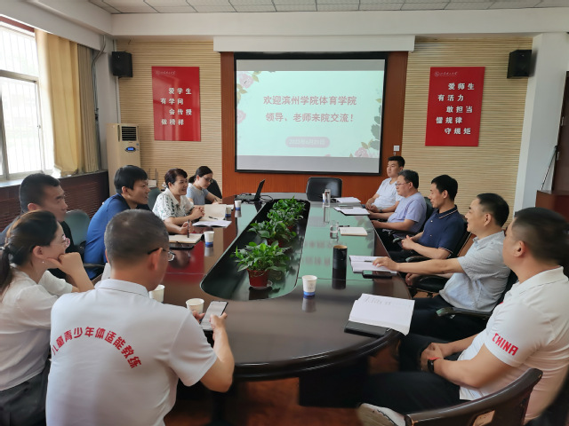 2022年6月21日上午,滨州学院团委书记、williamhill威廉希尔党总支书记于峰、williamhill威廉希尔院长张红霞等一行6人来访我院,并于2号教学楼111会议室进行交流座谈。我院党总支书记、院长魏法汇,科研副院长马国栋,教学副院长杨刚,体育教育系主任胡鹏,运动训练系主任高博,教学科研办公室主任韩军梅参加此次交流会。魏法汇致辞欢迎与会嘉宾的来访。