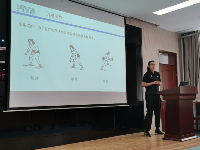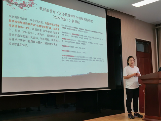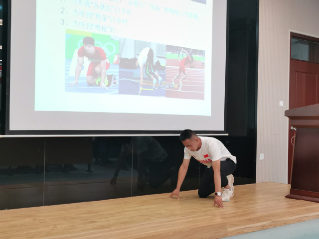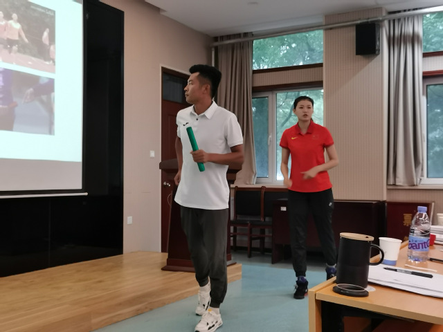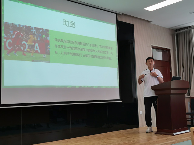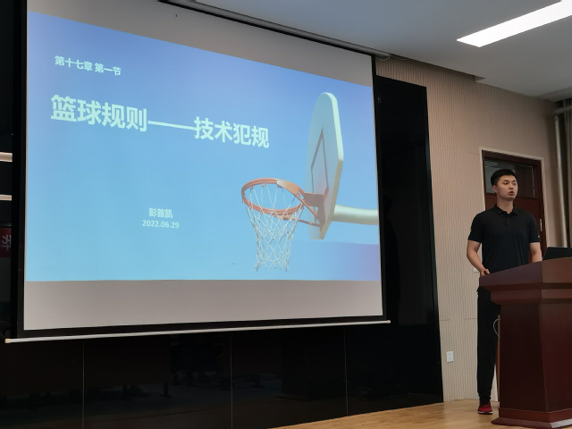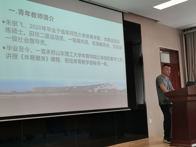 崔蓓蓓、范家辉、彭首凯、宋玉洁,魏程程、朱银飞六位新进教师分别以排球的传垫球、足球脚背正面踢球、篮球规则-技术犯规、田径接力跑交接棒技术与规则、武术腾空飞脚技术、短跑100米教学为主题,依次进行试讲。六位青年教师试讲准备充分,PPT制作简洁优美,课堂导入合理,教学方法得当,教学过程流畅,语言表达清楚,注重思政元素的融入和信息技术的运用,教学效果良好。