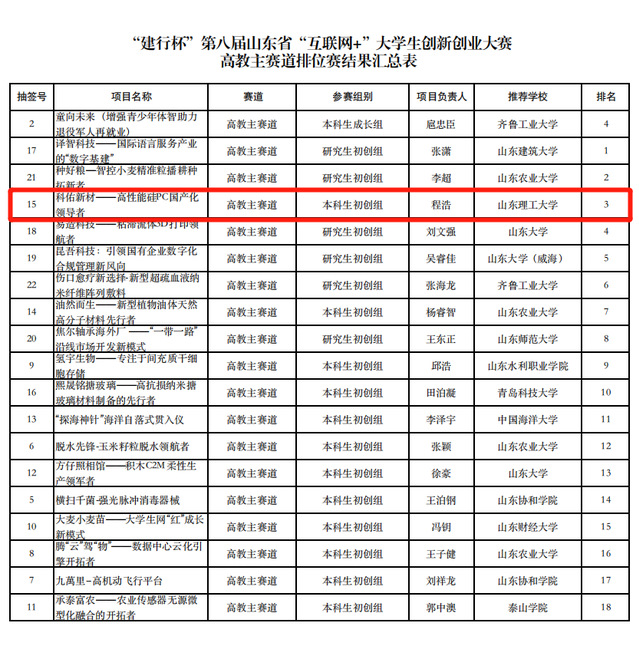 7月27日,“建行杯”第八届山东省互联网+大学生创新创业大赛总决赛圆满落下帷幕,经过激烈角逐,由我院盛红庆教授指导,我院2018届校友程浩、2019级王兴隆等15人团队完成的“科佑新材--高性能硅PC国产化领导者”项目荣获金奖,创我院师生参加A+类创新创业赛事的历史最好成绩。