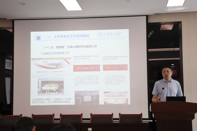 副院长马国栋就学院学科科研工作进行总结部署。首先,他通报了学院上半年高层次人才引进及省社科项目、山东省软科学等项目申报立项情况,指出了存在的问题,分析了具体原因,引导专业教师要紧盯2023年社科项目申报工作,提前谋划,充分准备,不断提升自身科研水平。围绕学科建设,他指出研究生招生工将作为下半年的工作重点,按照研究生培养方案落实好研究生导师的选聘和研究生联合培养基地的建设工作。最后,他就第四轮聘期考核的指标任务和下一步人才引育工作进行了解读。