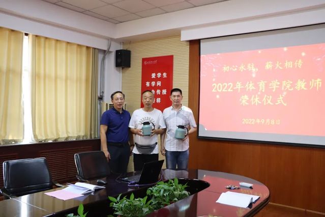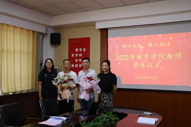 青年教师代表王晓舟、崔蓓蓓向光荣退休的教师献花,王介忠向荣休教师赠发精美纪念品。