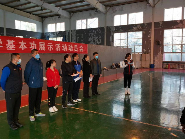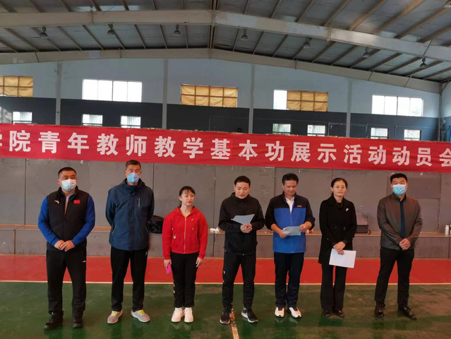 为进一步提高青年教师教学基本功,强化课堂教学规范,助力青年教师不断提高教学能力与水平,11月19日上午学院在体育馆召开青年教师教学基本功展示活动动员会。本次活动由副院长杨刚主持,学校教学督导归明,教学科研办公室主任韩军梅,公共体育教学系部主任郭涛,体育教育系主任胡鹏,运动训练系主任高博,体育教育系副主任王丹,教学秘书张鹏,学院2017年以来入职青年教师参加活动。