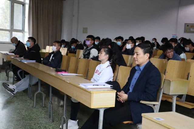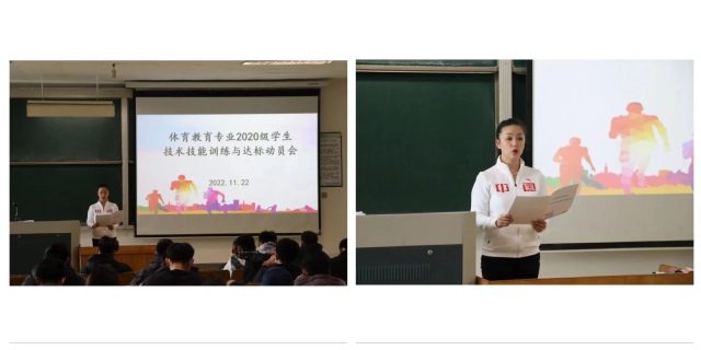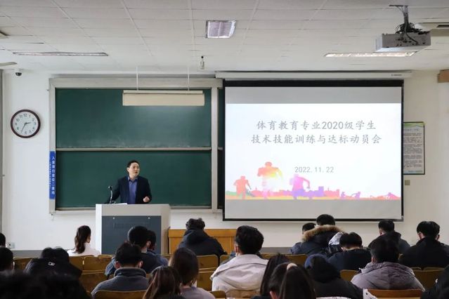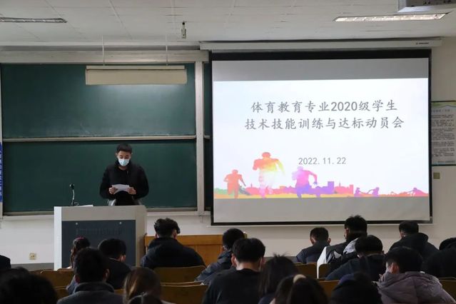 为进一步提高学生专业技术技能水平,更好的适应中学体育工作要求,提升体育教育专业学生实习支教工作质量,学院于11月22日下午在3#204教室召开体育教育专业2020级学生技术技能训练与达标动员会,党总支副书记赵鹏,副院长杨刚,学生工作办公室主任李昌朕,教学科研办公室主任韩军梅,体育教育系副主任王丹,教学秘书张鹏,辅导员索罗丹,辅导教师及2020级体教全体学生共同参会,会议由杨刚主持。