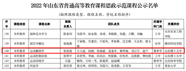 近日,2022年山东省课程思政示范项目已经公示完毕,我院《运动解剖学》课程成功立项(山东省仅立项3门体育类课程),成为我校省一流本科课程和省思政示范课双立项的14门本科课程之一。