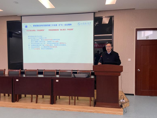 学院党总支书记、院长王介忠首先传达了校党委四届二次全委(扩大)会议精神,2023年为学校“开拓进取年”,是贯彻落实党的二十大精神的开局之年,也是学校落实第四次党代会各项主要任务的关键之年,学院上下要凝心聚力、开拓进取,为学院高质量发展做出贡献。随后,他就加强班子建设出台的相关文件进行领学,落实从严治党,明确班子分工,压实分管责任。最后,他提到要持续加强师德师风建设,回顾了优秀校友王书奇报告会“用心做好老师”的主题,强调各位老师要坚守教育红线底线,坚持立德树人根本任务,甘于奉献,爱岗敬业,做学生喜爱的老师。