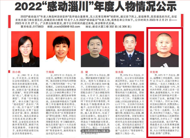 2022年12月16日,在淄川体育公园附近,一名老人不慎落入水中。当天最低温度-11℃,河水冰冷刺骨,水面上还有一层薄冰,救援难度极大。51岁的宋克林在听到呼救声后第一时间站了出来,毅然跳下冰河、下水救人。历时30分钟,宋克林在消防员、民警及热心群众的帮助下成功施救。