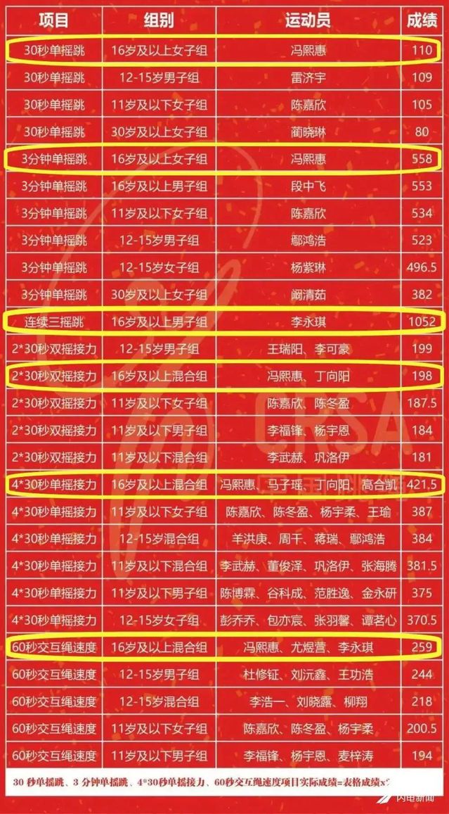 个人项目中,冯熙惠以220个和1116个的成绩,一人打破30秒和3分钟单摇跳两项世界纪录,平均每秒可跳7.3下;李永琪、尤煜营在连续三摇跳项目中分别跳出了1052个和549个的优异成绩,双双打破530个的世界纪录,李永琪也超越了701个的吉尼斯世界纪录。