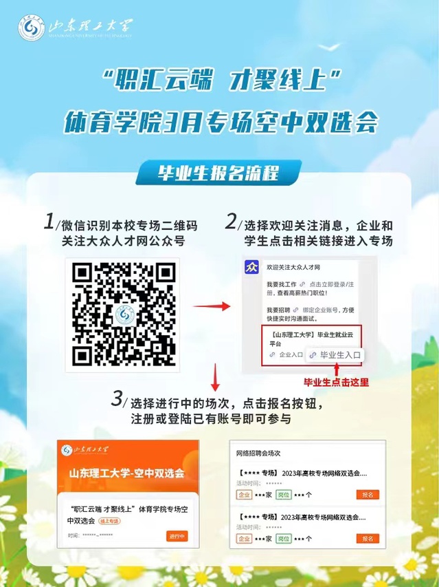 手机微信扫码关注“大众人才网”微信公众号,企业和毕业生分别点击相关按钮进入williamhill中国校招端口,点击本学院报名按钮,注册或登录已有账号即可直接参与。