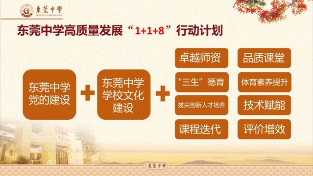 2022年,东莞中学迎来120周年校庆,并隆重发布了东莞中学高质量发展“1+1+8”行动计划,从党的建设、学校文化建设、卓越师资、“三生”德育、拔尖创新人才培养、课程迭代、品质课堂、体育素养提升、技术赋能、评价增效等10个方面擘画学校发展大计。