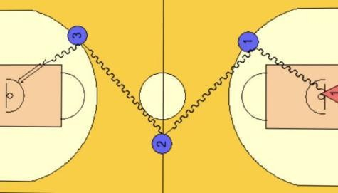测试方法:如下图所示,在球场端线中点站立,面向前场,右手运球至①处做背后运球,换左手运球至②处,做左手后转身运球变向,换右手运球至③处做胯下运球,换右手上篮。球进篮后,左手运球至③处做背后运球换右手,运球至②处做运球后转身变向,换左手运球至①处做胯下运球,换右手上篮。球进篮后再重复一次,累计上篮四次,第四次球中篮后结束。
