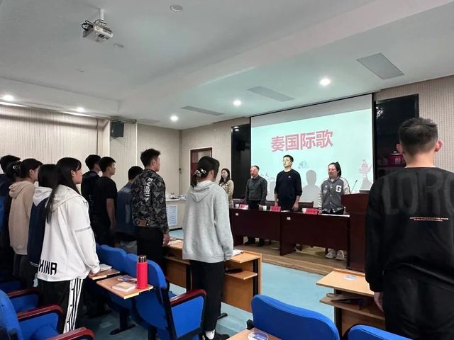 会议伊始,全体起立,奏唱国歌。