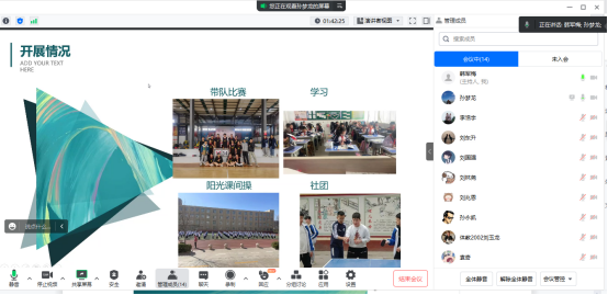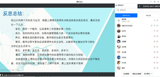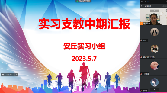 教育实习是我院教学工作的重要组成部分,是人才培养的关键实践环节,直接关系到我院本科教学质量。为确保教育实习工作的顺利进行,我院于2023年4月下旬-5月上旬举行了实习支教中期检查汇报工作。此次中期检查汇报各实习小组采用线上汇报形式进行,2020级体育教育全体实习生参加汇报,会议由各实习小组指导教师主持。