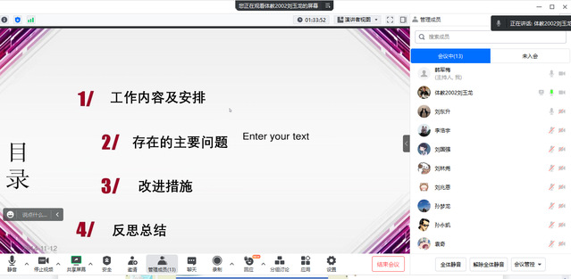 会上,指导教师介绍此次中期检查汇报的目的意义以及实习生汇报顺序。接着实习生依次采用PPT形式,主要围绕着实习支教过程中的体育课堂教学、观摩听课、教研活动、体育大课间组织、课外体育活动辅导、运动队训练与竞赛组织、班主任助理等工作开展情况进行汇报,并反思总结存在的问题和不足,提出下一步改进措施。各指导老师认真听取实习生的汇报后,就实习支教工作中存在的问题进行详细指导。