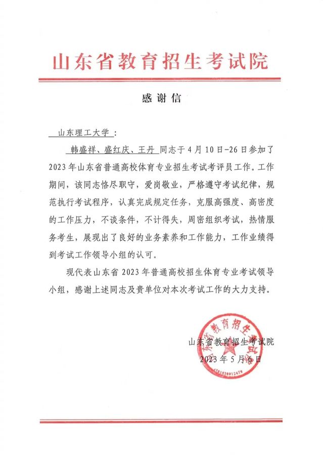 近日,williamhill威廉希尔收到了来自山东省教育招生考试院的感谢信。信中对我院韩盛祥、盛红庆、王丹三位老师在参加山东省普通高校体育专业招生考试考评员工作期间,我院三位老师良好的业务素养,工作能力和工作业绩得到了考试工作领导小组的认可和称赞。