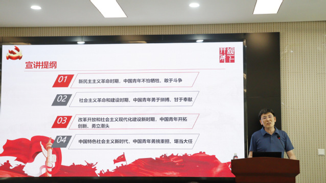 6月12日,学院党委副书记曹绪亮在2教119教室以《中国共产党光辉历程——学党史、知党情、跟党走》为题为学生第二党支部讲授专题党课。