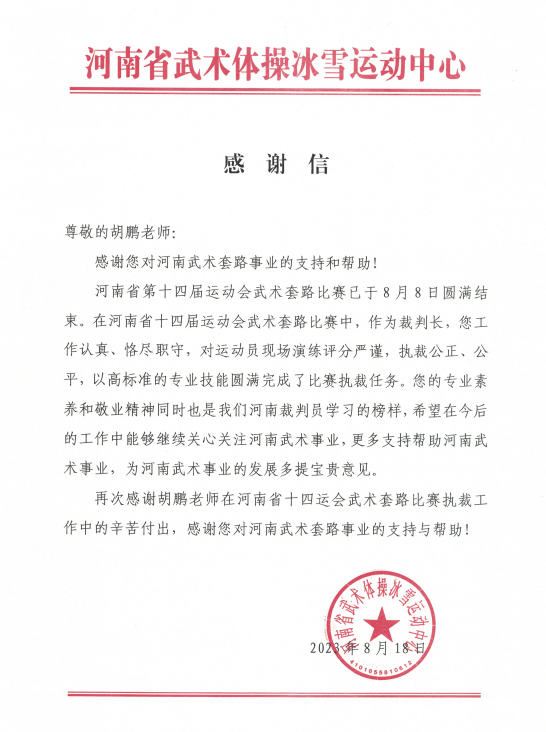 近日,williamhill威廉希尔收到来自河南省武术体操冰雪运动中心的感谢信。信中对我院胡鹏老师在河南省第十四届运动会武术套路比赛中担任裁判长的辛勤工作和敬业精神表示感谢并提出了认可和称赞。我院教师的专业素养、优秀表现赢得了河南武术事业的一致好评和赞誉。