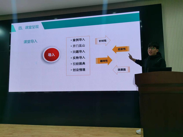 卢海龙结合自身参加校级和省级青年教师讲课比赛的经历,主要从教学设计、课件制作、课堂呈现、教学反思等几个方面做了经验分享,详细地阐述了如何在教学设计中体现学科前沿性、如何在教学目标中制定针对性措施、如何运用教学策略、选取教学资源和设计板书等,内容详实,可操作性强。观摩教师认真聆听,收获颇丰,并对卢老师的分享报以热烈的掌声。