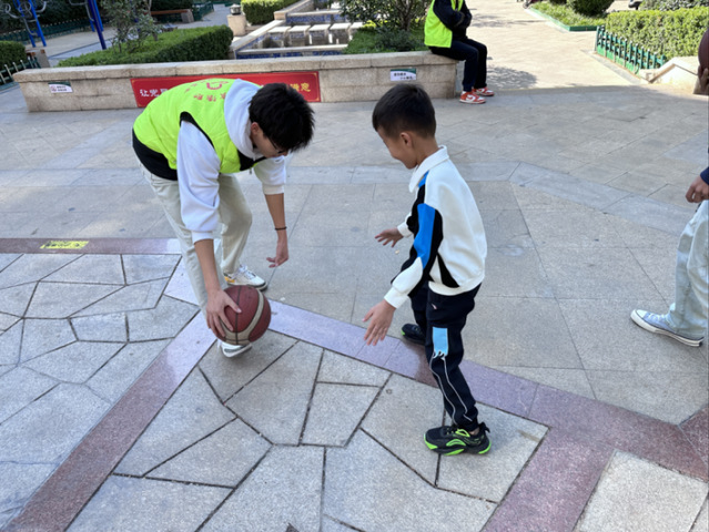 志愿者们利用本专业知识,为社区的孩子们讲解学习了“双手交换运球”、“低运球”等简单的篮球技术动作,锻炼了他们的协调能力和灵活性。在教学结束后,志愿者们采取“一对一”的方式对孩子们进行指导,进一步丰富了他们的课余生活,营造了健康、文明的社区氛围。