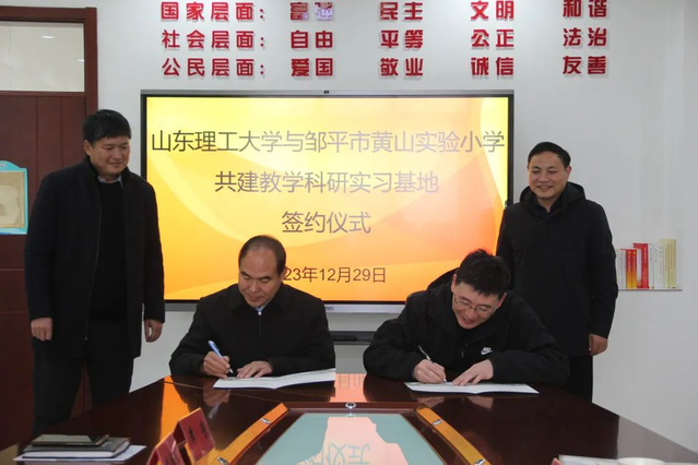 2023年12月29日,williamhill中国与邹平第一中学、邹平市实验中学、邹平市黄山实验小学共建师范教育实践基地暨合作签约仪式分别在三所学校隆重举行。williamhill威廉希尔党委书记、院长韩长江、williamhill威廉希尔副院长杨刚、教师教育学院教授王贵栋等一行3人,三所学校领导班子及部分教师参加了签约仪式。