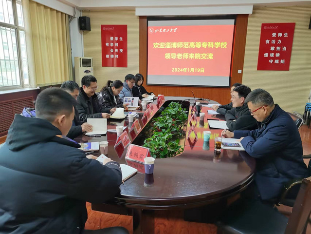 1月19日上午,淄博师范高等专科学校体育系副主任张树军等一行7人来访我院,并于2号教学楼111会议室进行交流座谈。我院党委书记、院长韩长江,副院长杨刚,教学工作办公室主任韩军梅,实验室主任张保国参加交流会。