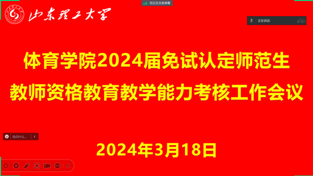 3月18日下午,学院组织召开2024届师范生免试认定教师资格教育教学能力考核工作腾讯会议,会议由教学工作办公室主任韩军梅主持,教学秘书白倩倩、2020级辅导员索罗丹和2020级体育教育专业全体学生参会。