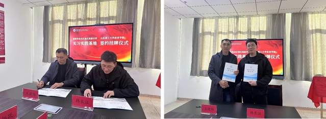 3月22日,我院与张店区潘庄高级中学实习实践基地签约授牌仪式隆重举行。学院党委书记、院长韩长江,党委副书记曹绪亮,副院长杨刚,运动训练系副主任刘云午与张店区潘庄高级中学董事长张太行,执行校长王晓炜等领导共同参加签约授牌仪式。